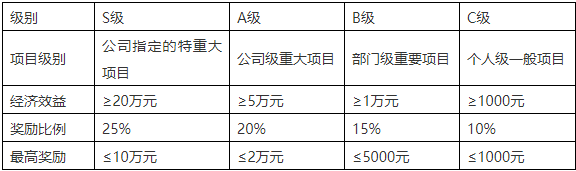 公司推行項(xiàng)目改善從質(zhì)量、成本、生產(chǎn)、交付、安全、設(shè)備改進(jìn)、團(tuán)隊(duì)及技術(shù)改善類等方面推進(jìn),不斷完善制度流程化建設(shè),同時(shí)建立獎(jiǎng)勵(lì)機(jī)制,按改善項(xiàng)目重要等級分S級、A級、B級、C級,按級別比例進(jìn)行最高獎(jiǎng)勵(lì)。