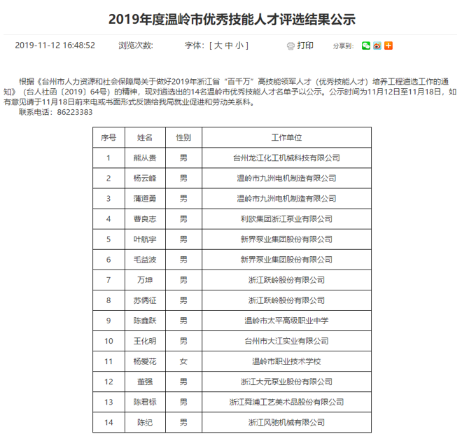 為高水平建設(shè)人才強省,進一步加快高技能人才隊伍建設(shè),我司根據(jù)《臺州市人力資源和社會保障局關(guān)于做好2019年浙江省“百千萬”高技能領(lǐng)軍人才培養(yǎng)工程遴選工作的通知》要求,通過我司推薦,經(jīng)資格初審、評委會評審等環(huán)節(jié),我司研發(fā)中心陳紀被評選為溫嶺市優(yōu)秀技能人才,并在網(wǎng)上予以公示,符合公司的價值觀 “客戶為先、誠信負責(zé)、團隊合作、務(wù)實創(chuàng)新”精神。