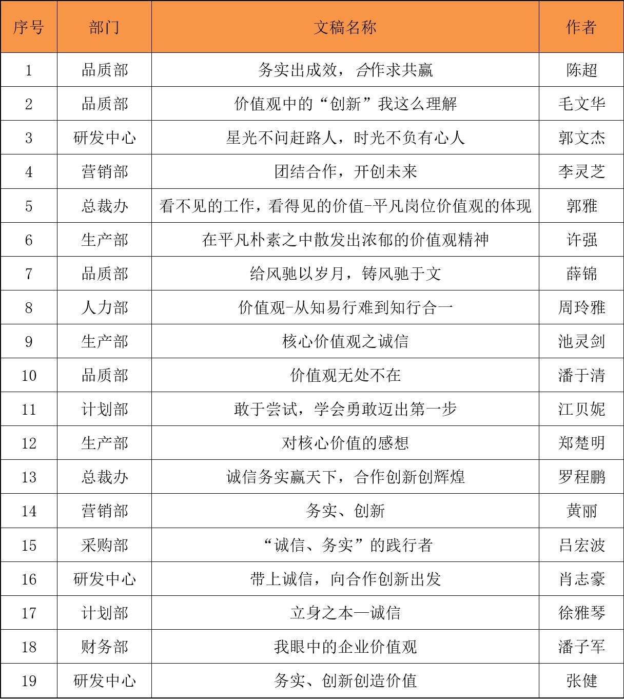 首先,評審組10位評委根據(jù)價值觀主題、文稿內(nèi)容,觀點表達清晰度,事實案例,語言表達流暢,文稿整體結構完整性,幾個方面對稿件進行了認真的打分,再依據(jù)分值排名匯總至執(zhí)行總裁最終審核,得出最終評審結果:品質部陳超的稿件《務實出成效,合作求共贏》緊扣征文主題,內(nèi)容充實,結合實際,贏得各位評委的一致好評,一舉奪得本次征文活動的一等獎。品質部毛文華的稿件《價值觀中的“創(chuàng)新”我這么理解》、研發(fā)中心郭文杰的稿件《星光不問趕路人,時光不負有心人》獲得本次征文的二等獎,兩篇從不同角度述了創(chuàng)新理念,只有做到敢于創(chuàng)新,才能在激烈的市場競爭中脫穎而出;營銷部李靈芝的稿件《團結合作,開創(chuàng)未來》、總裁辦郭雅的稿件《看不見的工作,看得見的價值-平凡崗位價值觀的體現(xiàn)》獲得三等獎。