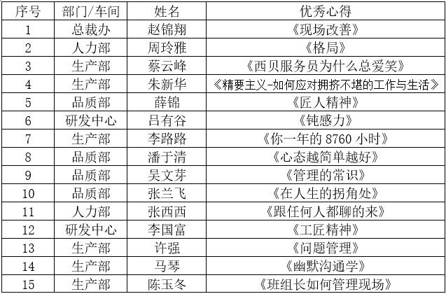 本次為第四季度讀書心得評選活動(dòng),經(jīng)總裁辦校對、審核,從100多篇心得中初選出30篇,再根據(jù)主題明確、立意新穎、結(jié)合工作實(shí)際、文字通順完整等篩選出16篇優(yōu)秀心得,其中獲得本季度“最佳讀書心得”得主是生產(chǎn)部潘靈橋《不會帶團(tuán)隊(duì),你就只能干到死》。其余優(yōu)秀文稿如下: