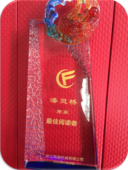 通過對四個(gè)季度最佳及優(yōu)秀心得匯總,經(jīng)公司領(lǐng)導(dǎo)層最終評選生產(chǎn)部潘靈橋?yàn)?019年度“最佳閱讀者”,并授予該榮譽(yù)獎(jiǎng)杯。